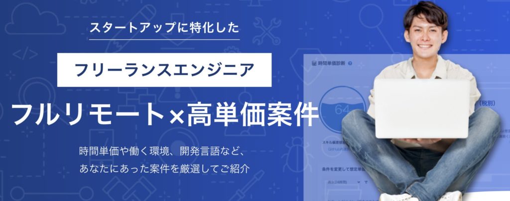 | 特徴 | 業界最大級12職種・44言語のフリーランス案件を保有 | スタートアップ案件に特化しておりフルリモート率80% | フルリモート・週3日から稼働できる案件が豊富 |