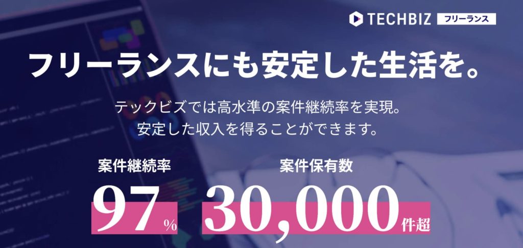 「テクフリ」は、フリーランスエンジニアやクリエイターに特化したエージェントで、大手企業やベンチャー企業の案件、上流工程の案件など、幅広い案件を取り扱っています。