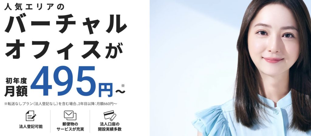 登記や名刺、Webサイトに使える住所を低コストで利用でき、郵便転送や電話代行など便利なオプションも充実しています。