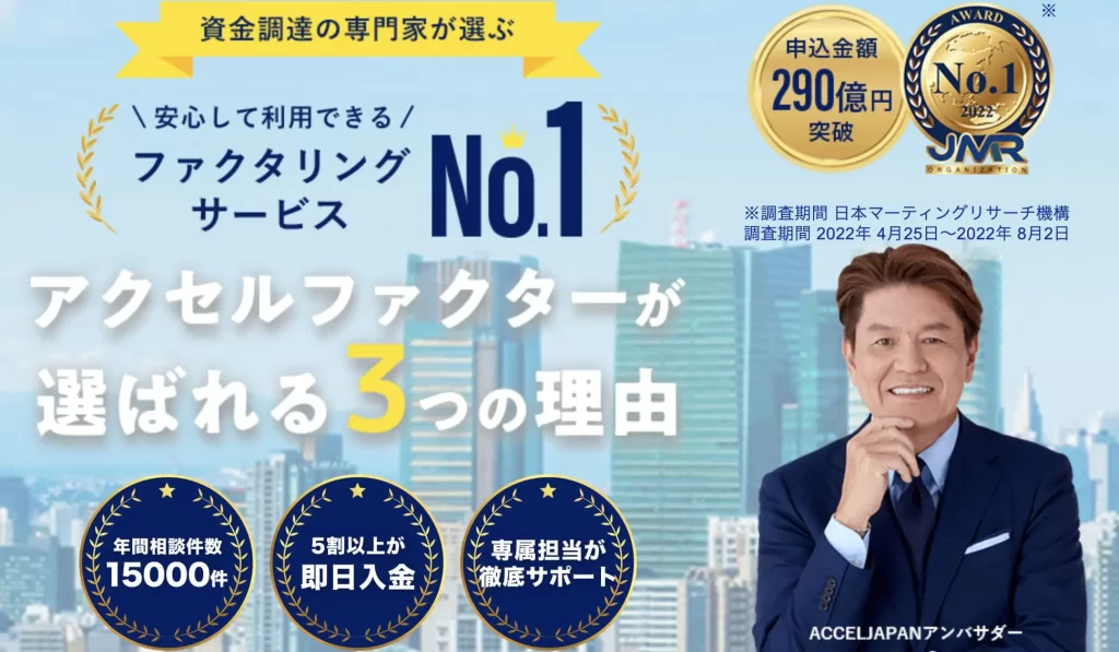 アクセルファクター」は、大手グループ会社が運営するファクタリングサービスなので、調達可能額の上限が1億円と高額な債権にも対応しています。