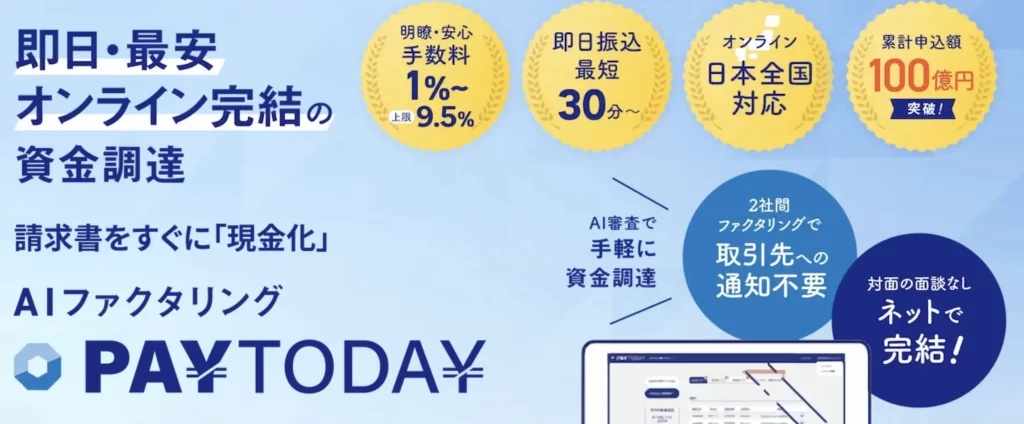 「PayToday」は、入金待ちの請求書を売却することで、早期に運転資金を調達できる「借りない資金調達サービス」です。フリーランスや法人など、どなたでも利用可能です。