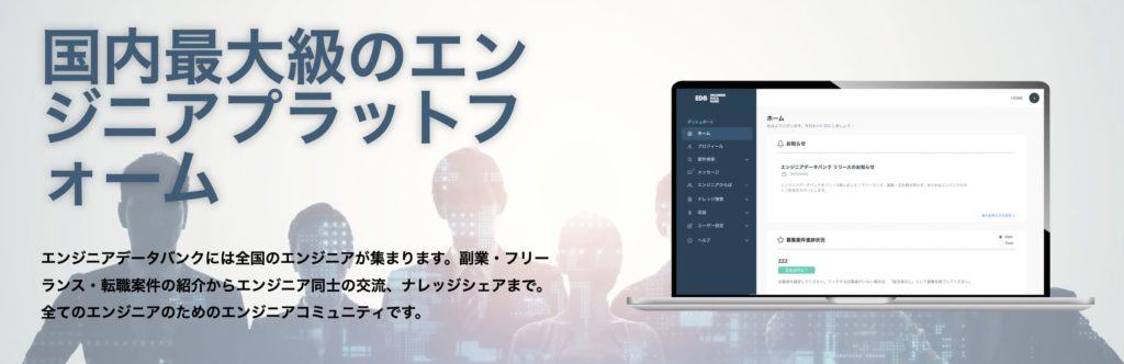 「エンジニアデータバンク」に登録すると、エンジニアの副業案件に応募したり、SNS機能を用いた登録者同士の交流、ナレッジシェアなどのサービスを無料で利用できます。