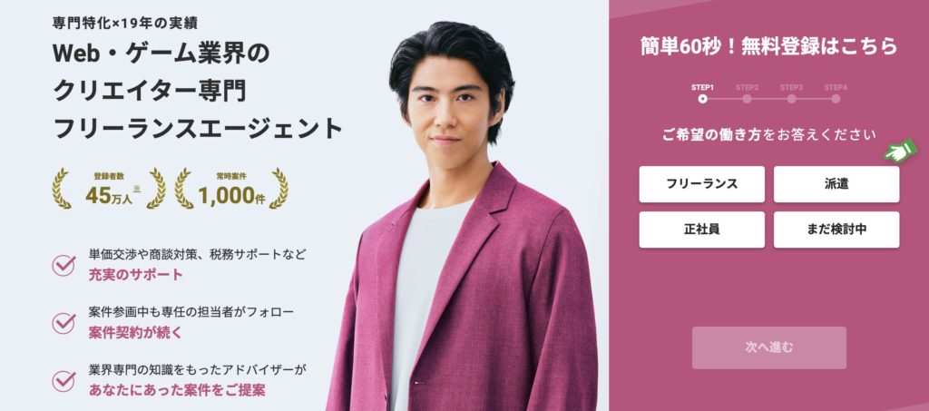 他エージェントと比べるとアフターサポートが充実しており、フリーランス1名につき3名の専任担当がつきます。専任担当は案件が途切れないよう手厚くサポートしてくれます。