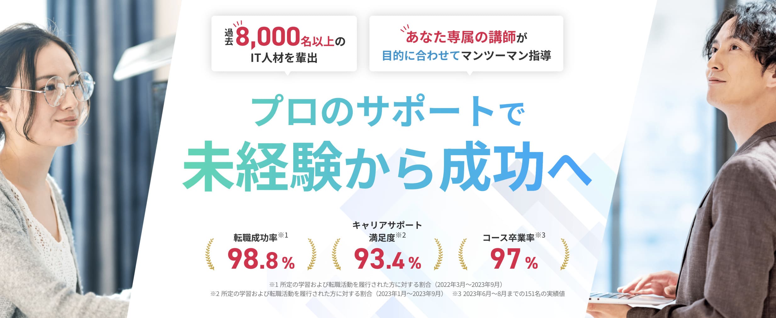「テックアカデミー」では、採用率10%以下の厳しい選考を通過した現役のWebデザイナー講師が、学習からお仕事の獲得・納品までマンツーマンでサポートしてくれます。