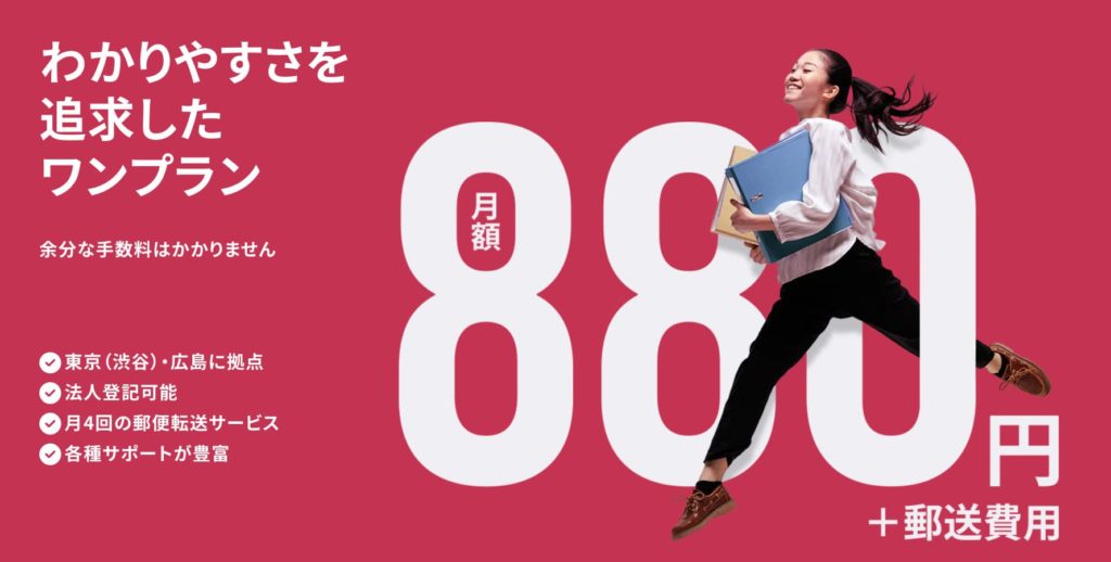 バーチャルオフィス1は、法人登記と週1回の郵便転送サービスが含まれるプランであれば月額880円で利用できます。