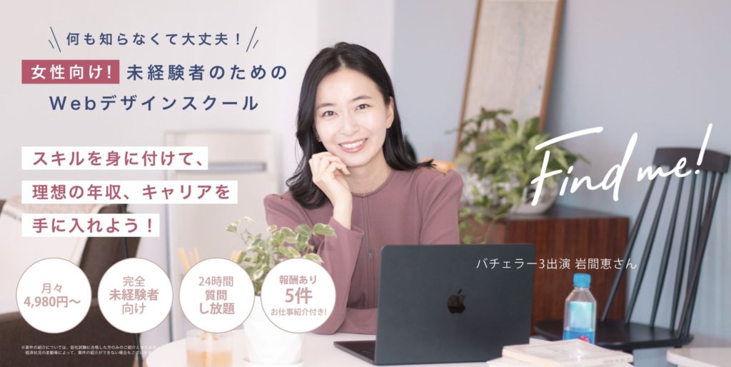 「Find me!」は、女性専用の月額制Webデザインスクールです。完全未経験からPhotoshop、XD、HTML/CSS、WordPress、デザインの考え方を実践レベルまで身に付けることができます。